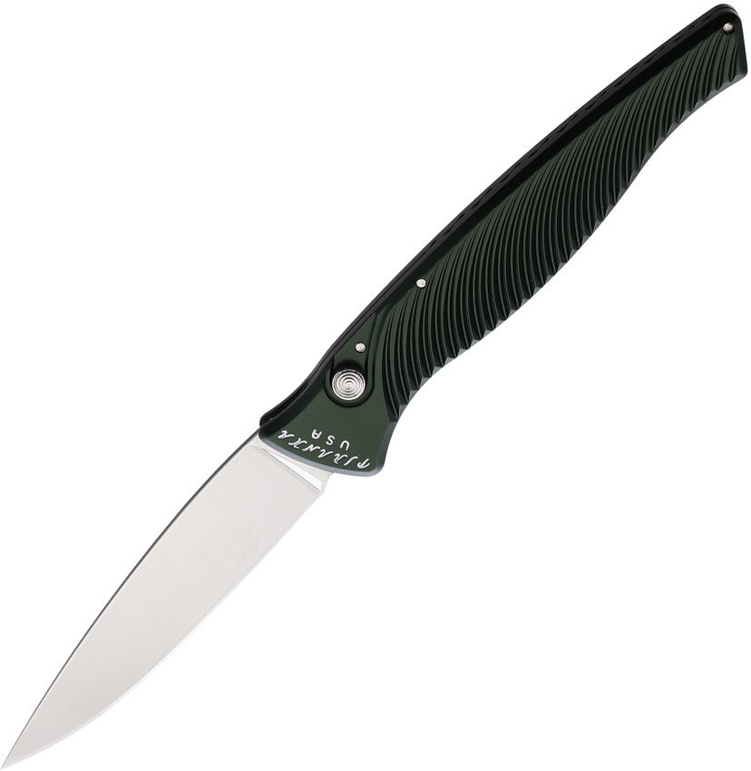 Automatic opening. 4.13" (10.49cm) closed. 3.25" (8.26cm) satin finish 154CM stainless blade. Green aluminum handle....