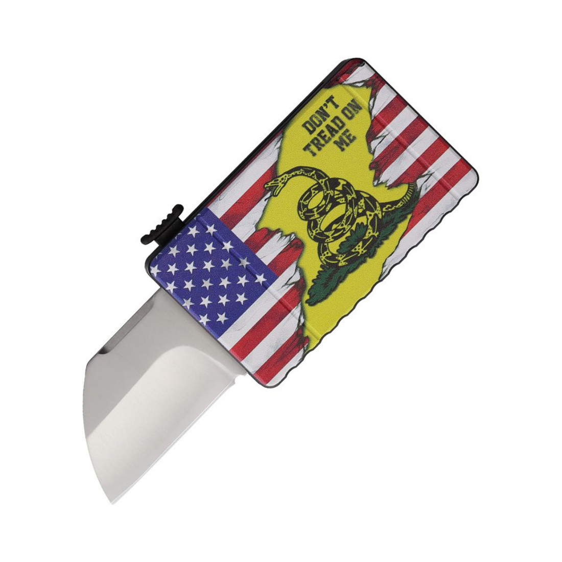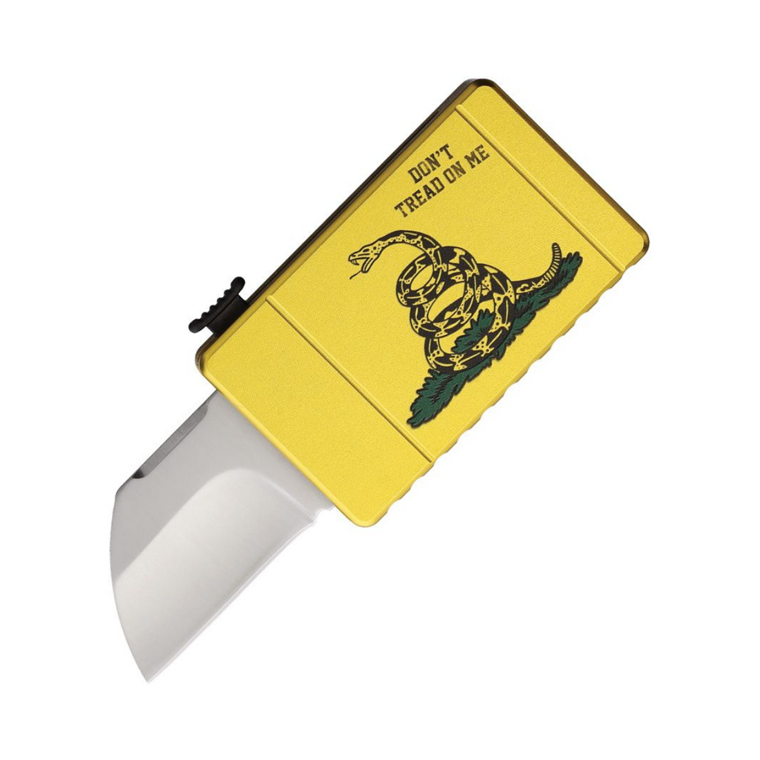 2.5" (6.35cm) closed. 1.63" (4.14cm) satin finish stainless sheepsfoot blade. Gold finish aluminum handle. Money/Pocket...