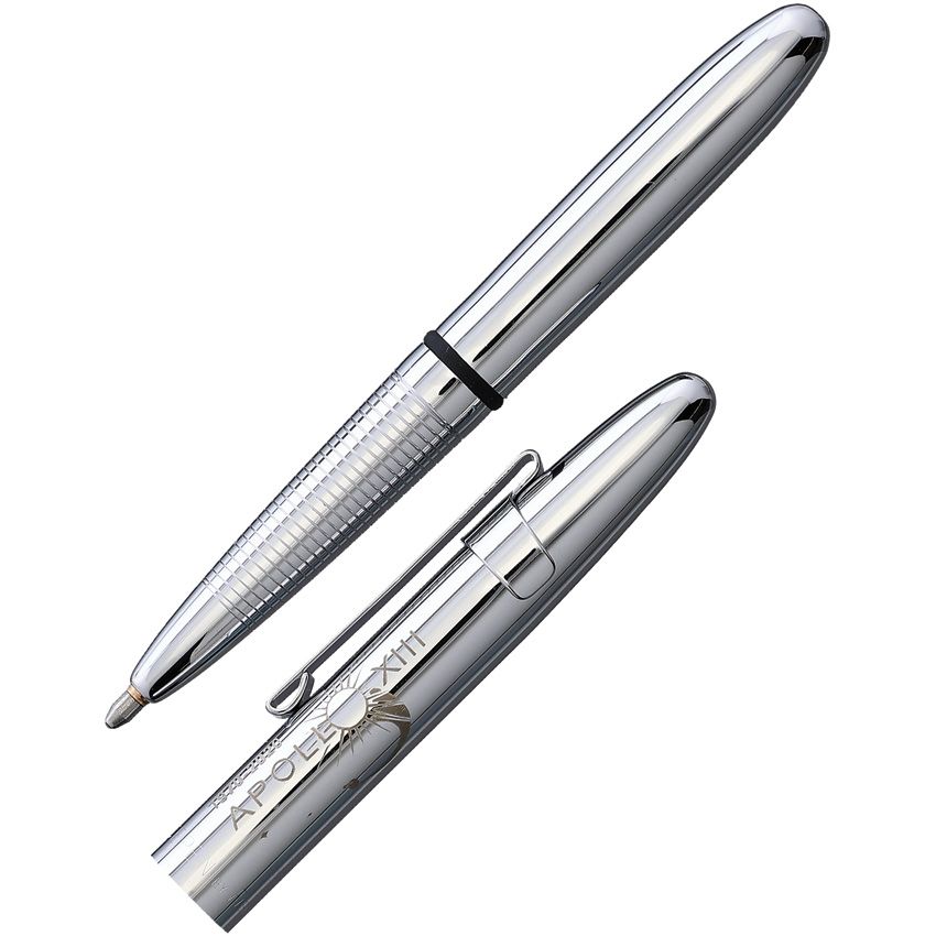 Pocket clip. 3.75" closed. PR4 black ink, medium point cartridge. Writes upside down, at any angle, under water, over grease, and in extreme temperatures. Color: Chrome with Apollo 13 engraving. Boxed.