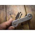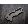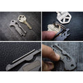 2.25" overall. Fits into virtually all key holder/organizers (i.e. KeySmart, KeyBar, Orbitkey, etc.) or simply attaches to your keychain. TSA safe. Eight functions: Split ring plier; box opener; screw driver; pry tip; nail file; inch and millimeter measurement scale engraving; Pocket hanger. Titanium construction. Boxed.