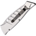 Automatic opening. 4.63" (11.76cm) closed. 3.25" (8.26cm) mirror finish 154CM stainless blade. Silver aluminum handle. Lanyard hole. Pocket clip. Boxed.