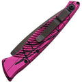 Automatic opening. 4.5" (11.43cm) closed. 3.25" (8.26cm) black DLC coated CPM S30V stainless blade. Black and pink sculpted aluminum handle. Pocket clip. Boxed.