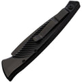 Automatic opening. 4.5" (11.43cm) closed. 3.25" (8.26cm) black CPM S30V stainless blade. Black sculpted aluminum handle. Pocket clip. Boxed.