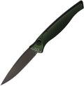 Automatic opening. 4.5" (11.43cm) closed. 3.25" (8.26cm) black CPM S30V stainless blade. OD green sculpted aluminum handle. Pocket clip. Boxed.