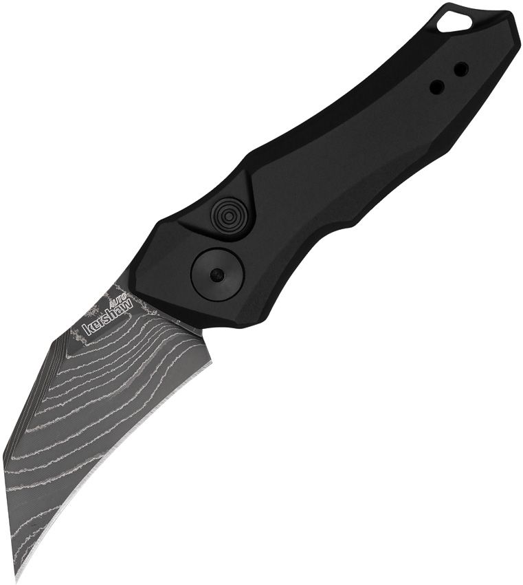 Automatic opening. 3.25" (8.26cm) closed. 2" (5.08cm) Damascus steel blade. Black anodized aluminum handle. Pocket clip. Boxed.