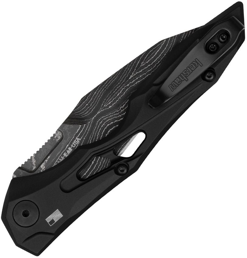 Automatic opening. 4.5" (11.43cm) closed. 3.5" (8.89cm) Damascus steel Wharncliffe blade. Black anodized aluminum handle. Pocket clip. Boxed.