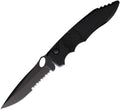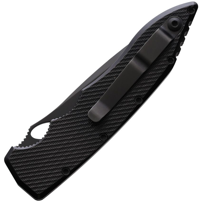 Automatic opening. 4.25" (10.8cm) closed. 3.5" (8.89cm) black oxide coated partially serrated CPM S30V stainless spear point blade. Black aluminum handle. Pocket clip. Thumb pull. Boxed.