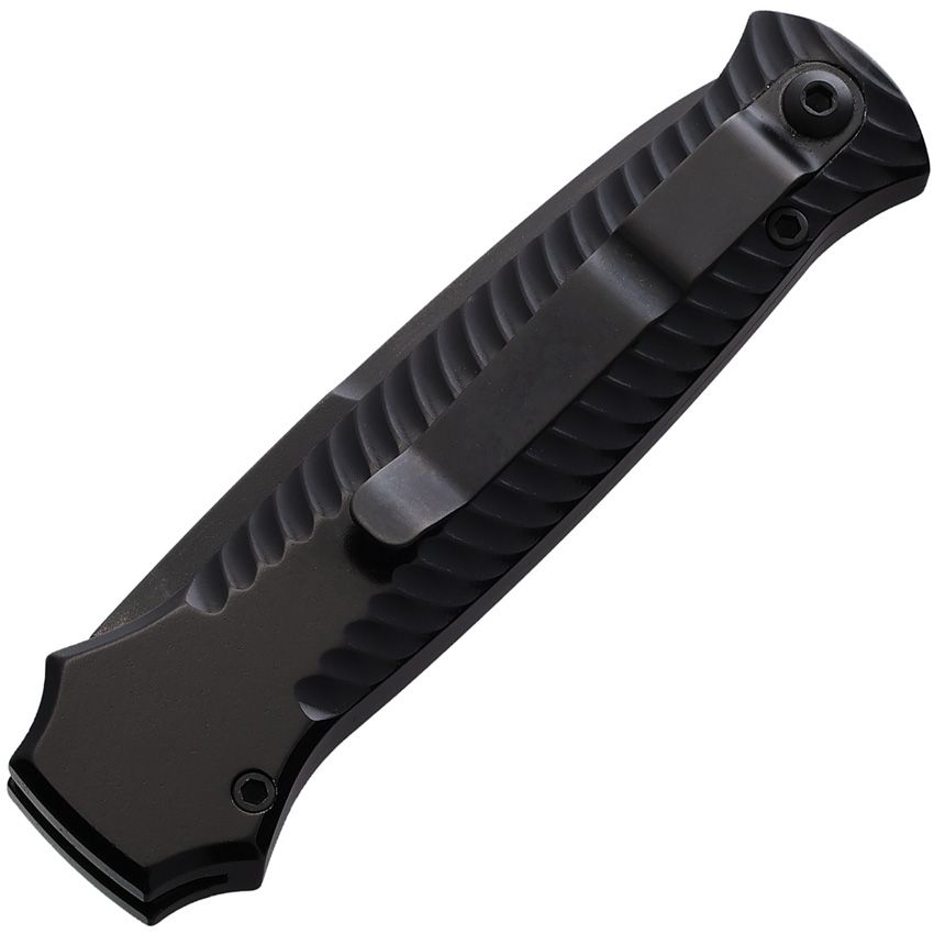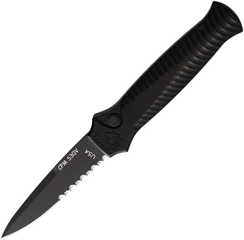 Automatic opening. 3.63" (9.22cm) closed. 2.75" (6.99cm) black partially serrated CPM S30V stainless spear point blade. Black aluminum handle. Pocket clip. Boxed.