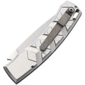Automatic opening. 4.13" (10.49cm) closed. 3.25" (8.26cm) mirror finish 154CM stainless blade. Silver aluminum handle. Lanyard hole. Pocket clip. Cross pattern milled handle. Boxed.