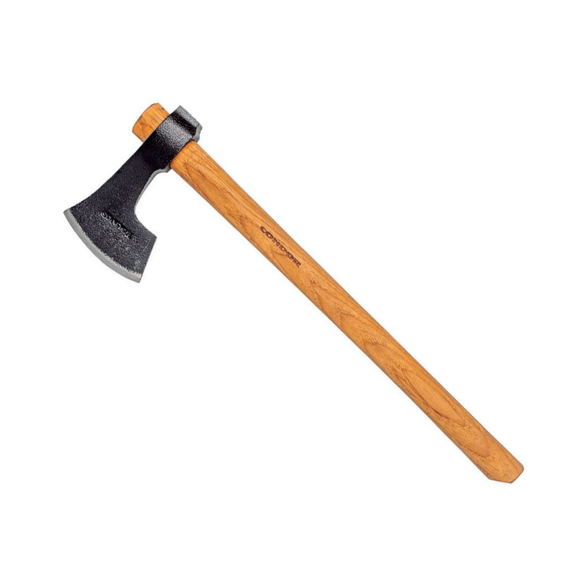 19.25" overall. 6.25" Condor classic finish 1060HC steel axe head with 4" cutting edge. American Hickory handle. Shoulder sling. Brown leather belt sheath. Boxed.