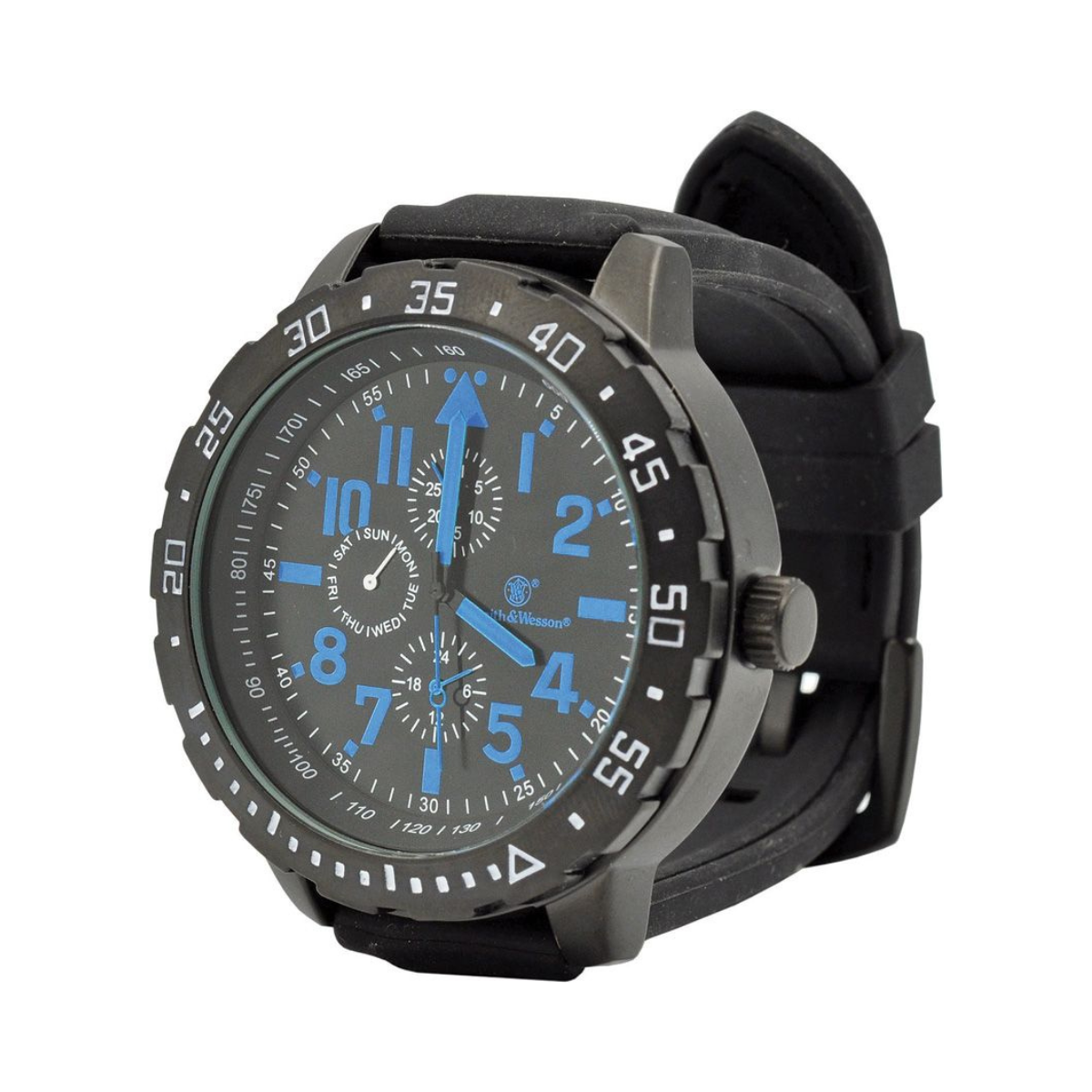 Other Info: 51 X 15mm face. 5ATM. Japanese movement. Second hand and date. Stainless case back. Blue numerals and hands. Black rubber strap with white stitching. Boxed.