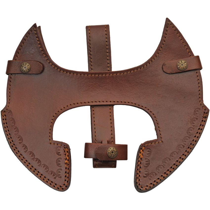 32.5" overall. 11" stainless axe head with 9" cutting edge. Blade artwork. Burnt ash wood handle. Brown leather belt sheath. Boxed.
