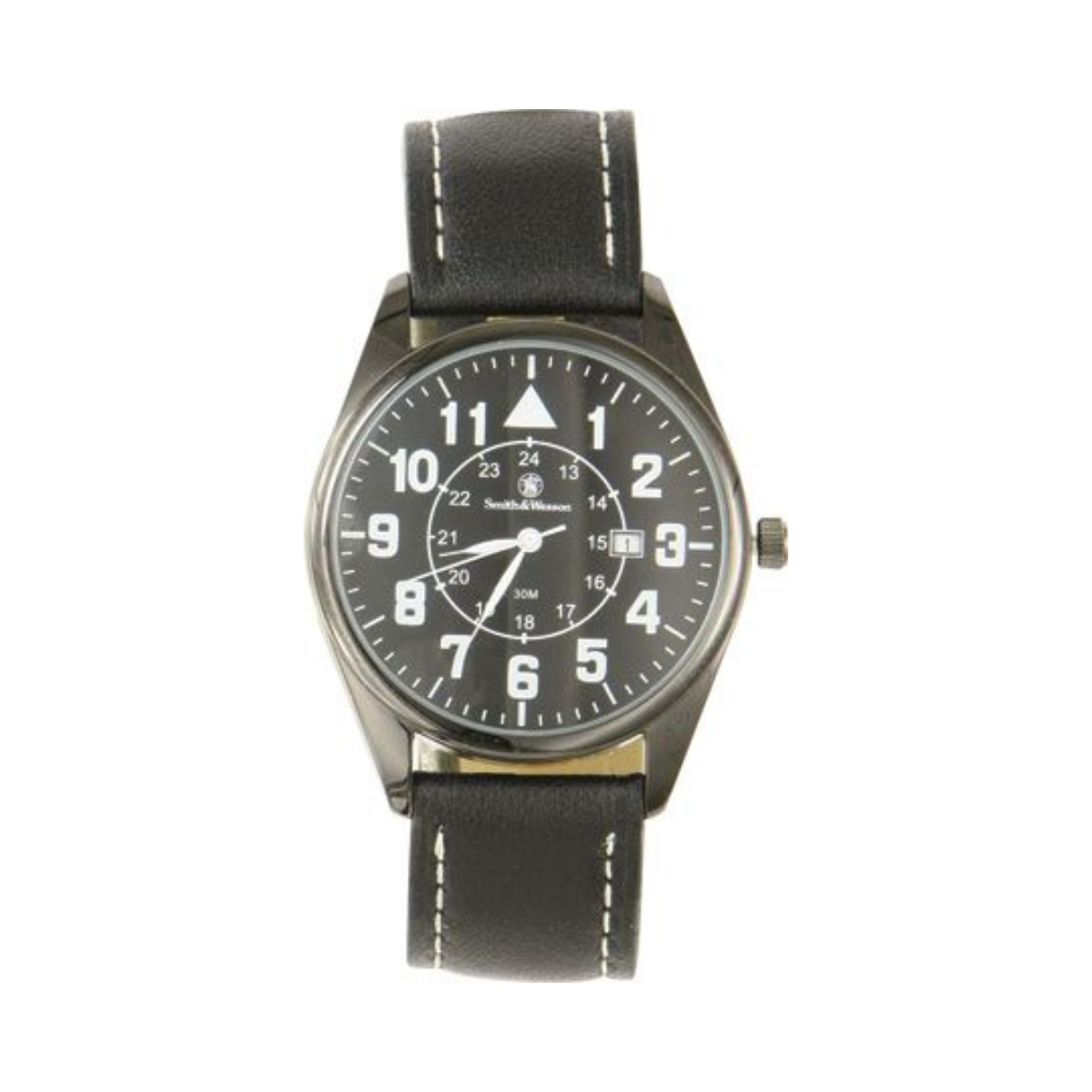 Black face. Black finish stainless construction with polished stainless back. White hands and numerals. Features military time inset. Water resistant to 30m. Black leather wrist band. These watches feature: Luminous hands and stainless markers. Water resistant to 300 feet. Second hand and date. Japanese quartz movement.