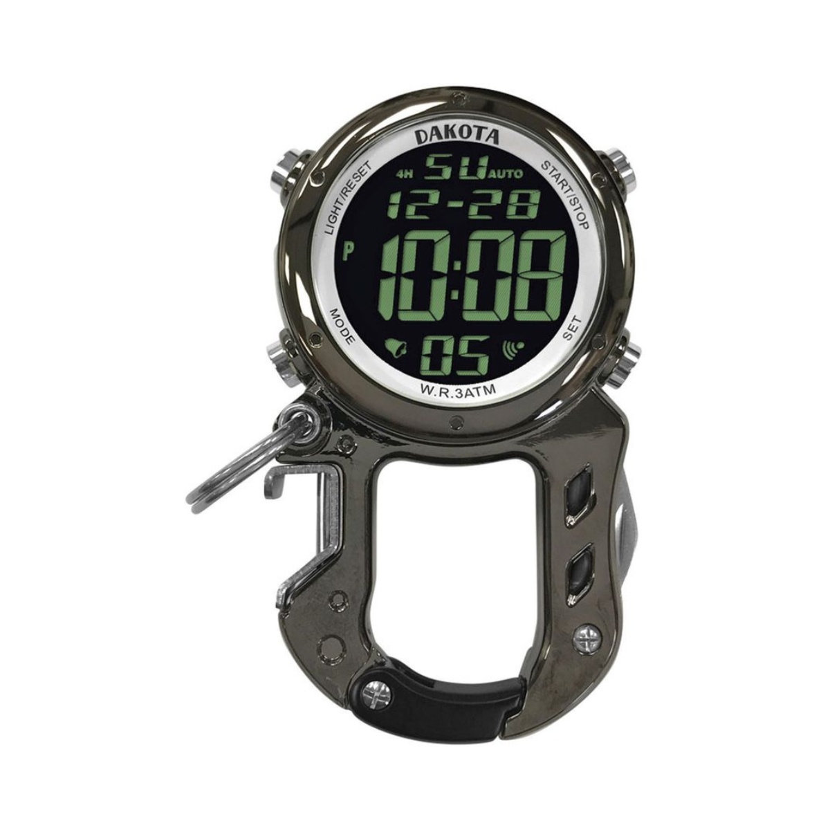 Reverse digital E.L. Dial. Polished gunmetal case. 100ft water resistant. Moonglow Electro Luminescent dial light. Alloy case. Integrated carabiner clip. Stopwatch. Countdown timer. Dual time. Alarm with chime. Bottle opener. Small blade. Attached split ring. Mineral crystal glass. Stainless case back. Boxed.
