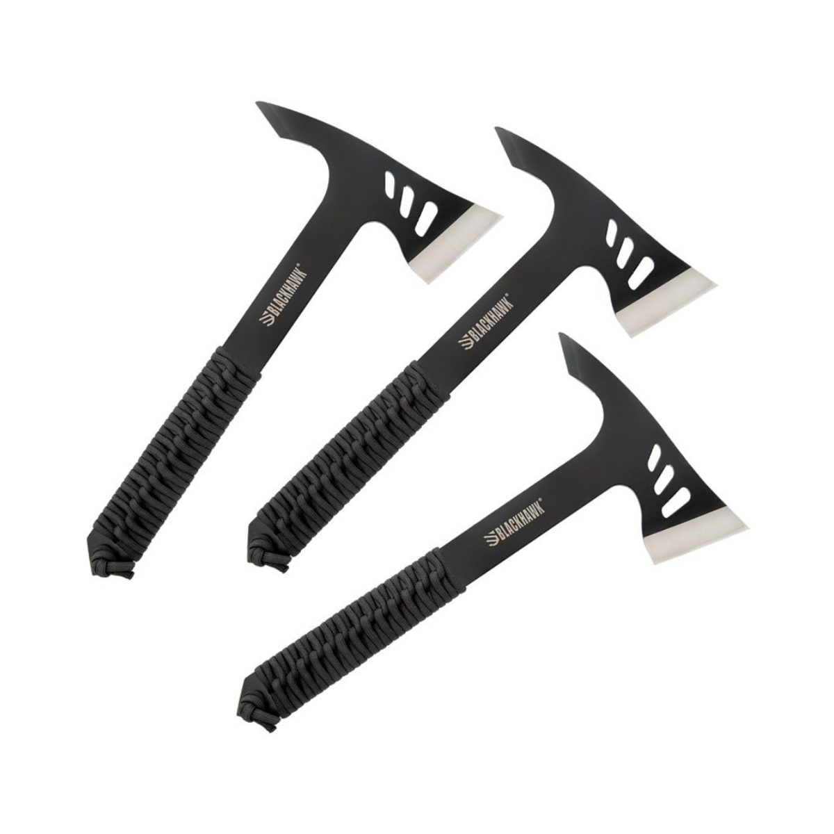 10.5" overall. 5.25" black finish 420 stainless axe head with 2" cutting edge. Black cord wrapped handle. Set of three. Sharpened spike end. Black ballistic nylon belt sheath. Boxed with hanging tab.