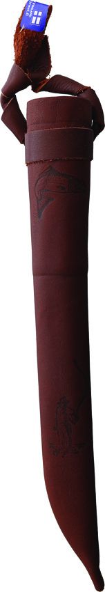 10.5" (26.67cm) overall. 6.25" (15.88cm) mirror finish stainless fillet blade. Curly Birch handle. Fish on sheath. Brown leather belt sheath. Bulk packed.