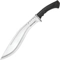 19.63" overall. 13.13" satin finish 7Cr17MoV stainless blade. Black TPR handle. Lanyard hole. Inward curving gurka blade profile. Black leather belt sheath. Boxed.