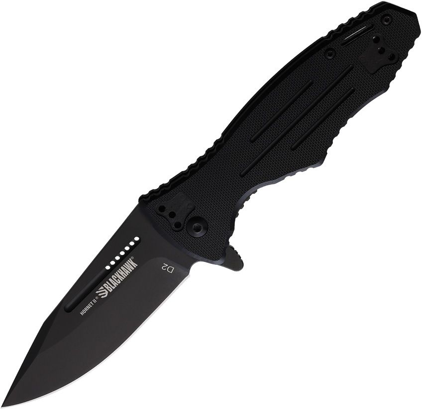 Assisted opening. 4.5" (11.43cm) closed. 3.5" (8.89cm) black DLC coated D2 tool steel drop point blade. Black G10 handle. Extended tang. Lanyard hole. Pocket clip. Boxed.