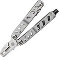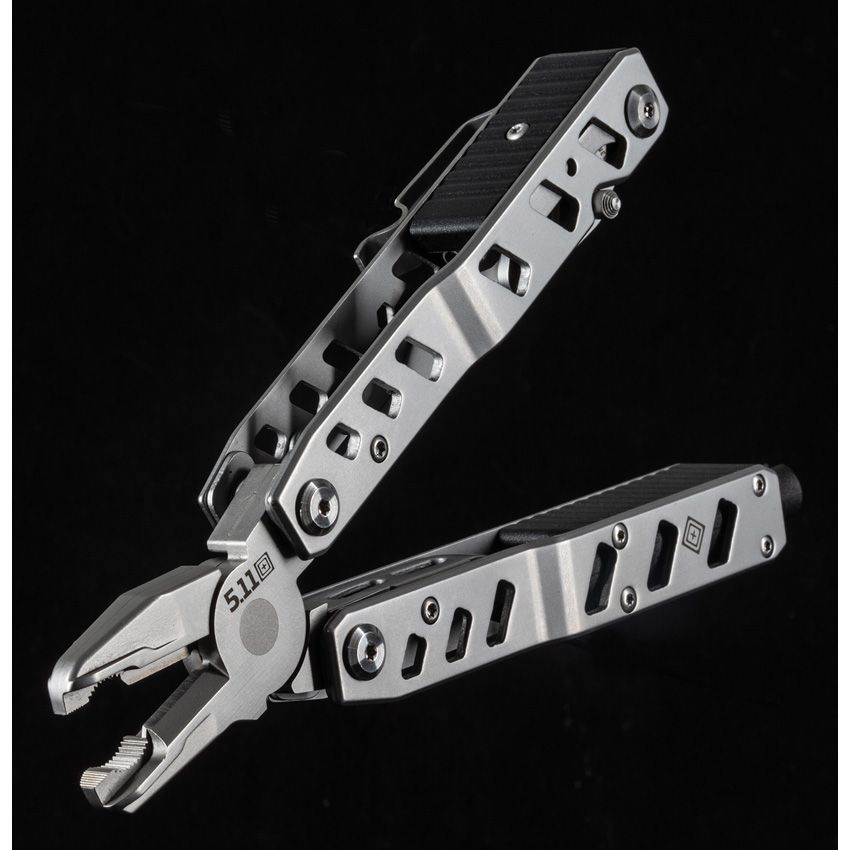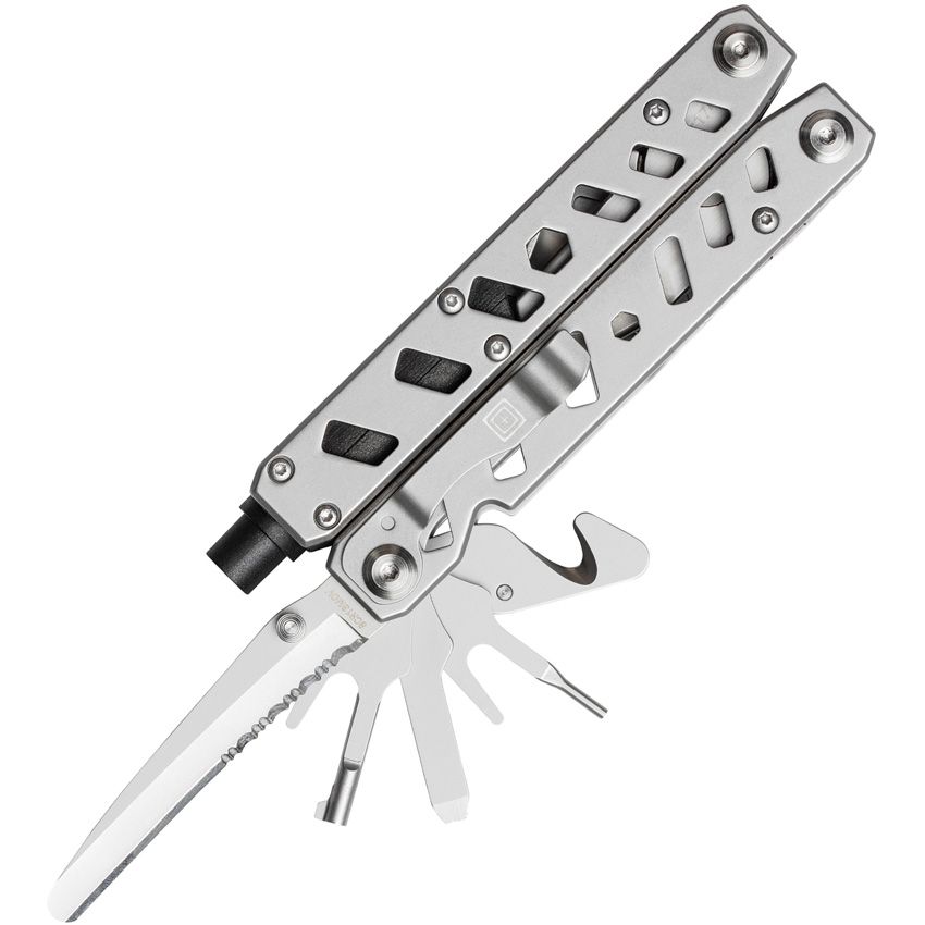 4.75" closed. 6.5" overall. Stainless handles. Tools include: Wire cutter l Oxygen wrench l Pliers l Glass breaker l Serrated blade l Belt/cord cutter l Pocket clip. Flat pliers I 1/4+4mm hex bit holder I Flat PH3 bit driver I Slotted driver I Cuff key I Cuff double lock.