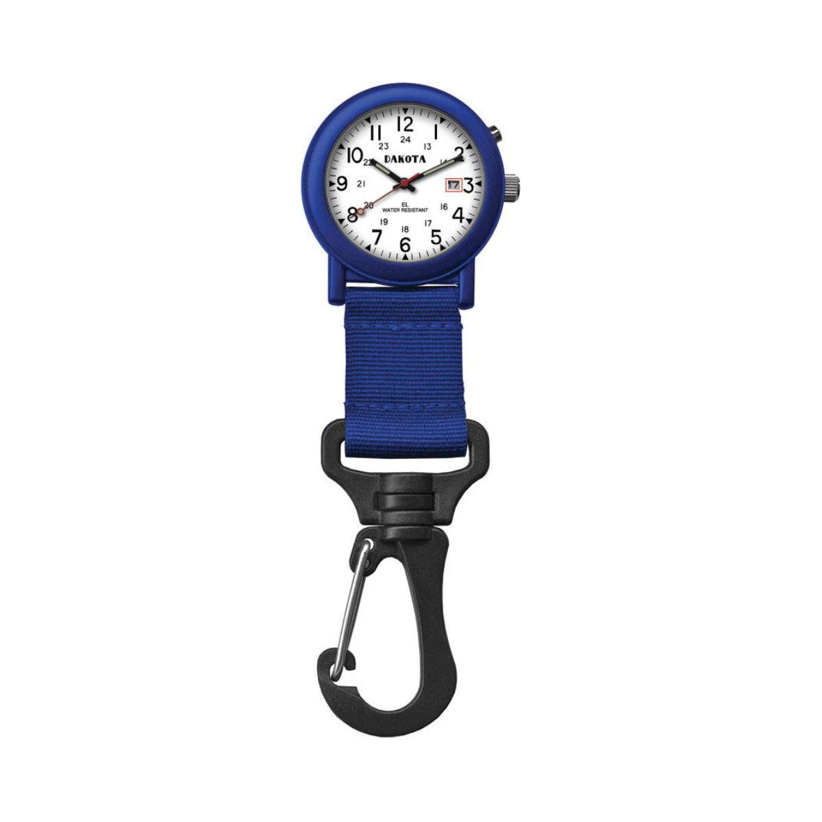 Features blue aluminum casing and bezel. Stainless back. Moonglow Electro Luminescent dial light. White face with black numerals. Luminescent hands. Second hand. Date. 100 ft. Water resistant. Blue nylon fob. Black plastic attachment clip. Color: Blue. Wooden gift box.