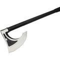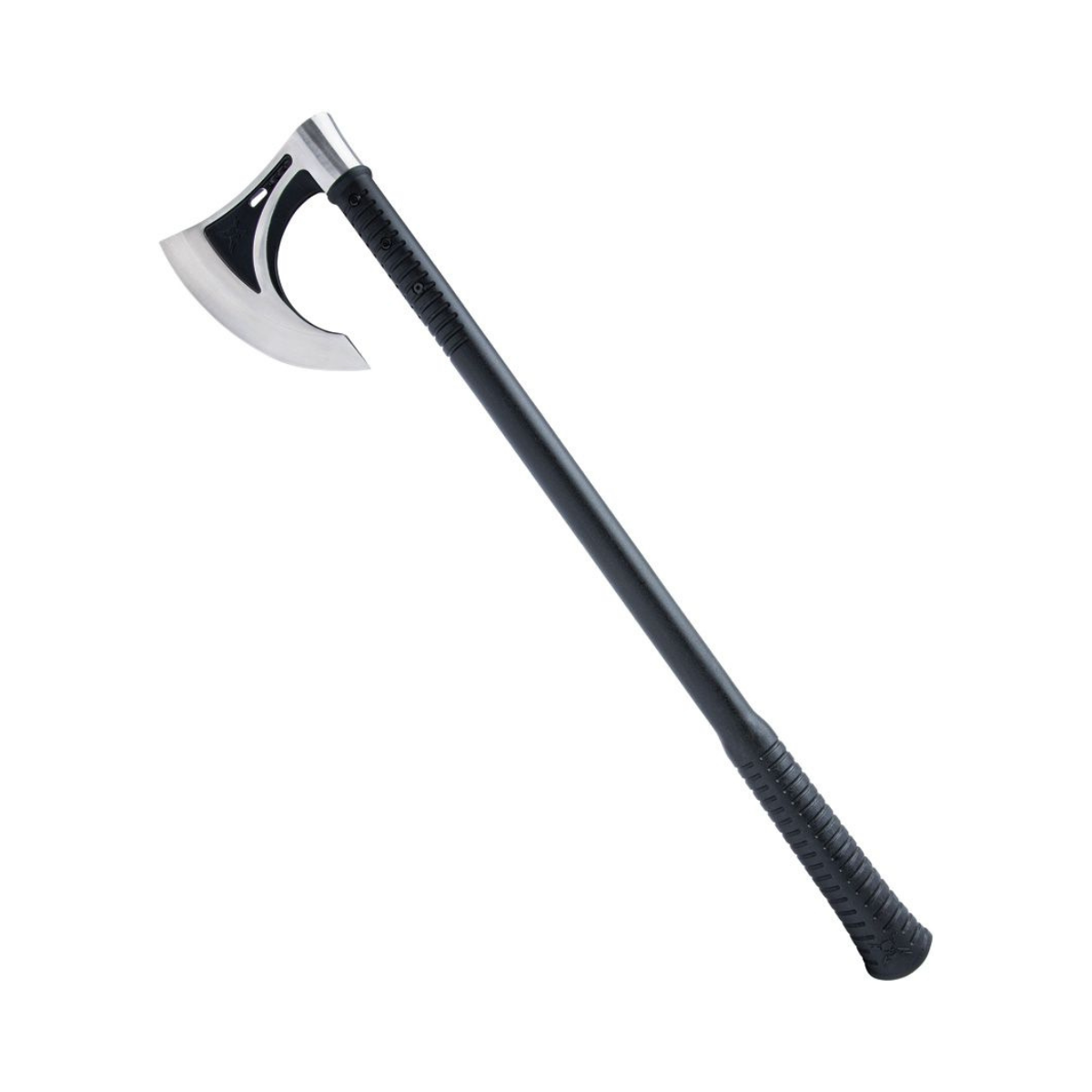 27.5" overall. 6.25" two-tone finish 3Cr13 stainless axe head with 6.88" cutting edge. Black injection molded, nylon reinforced fiberglass handle. Injection molded TPU and nylon belt sheath. Boxed.