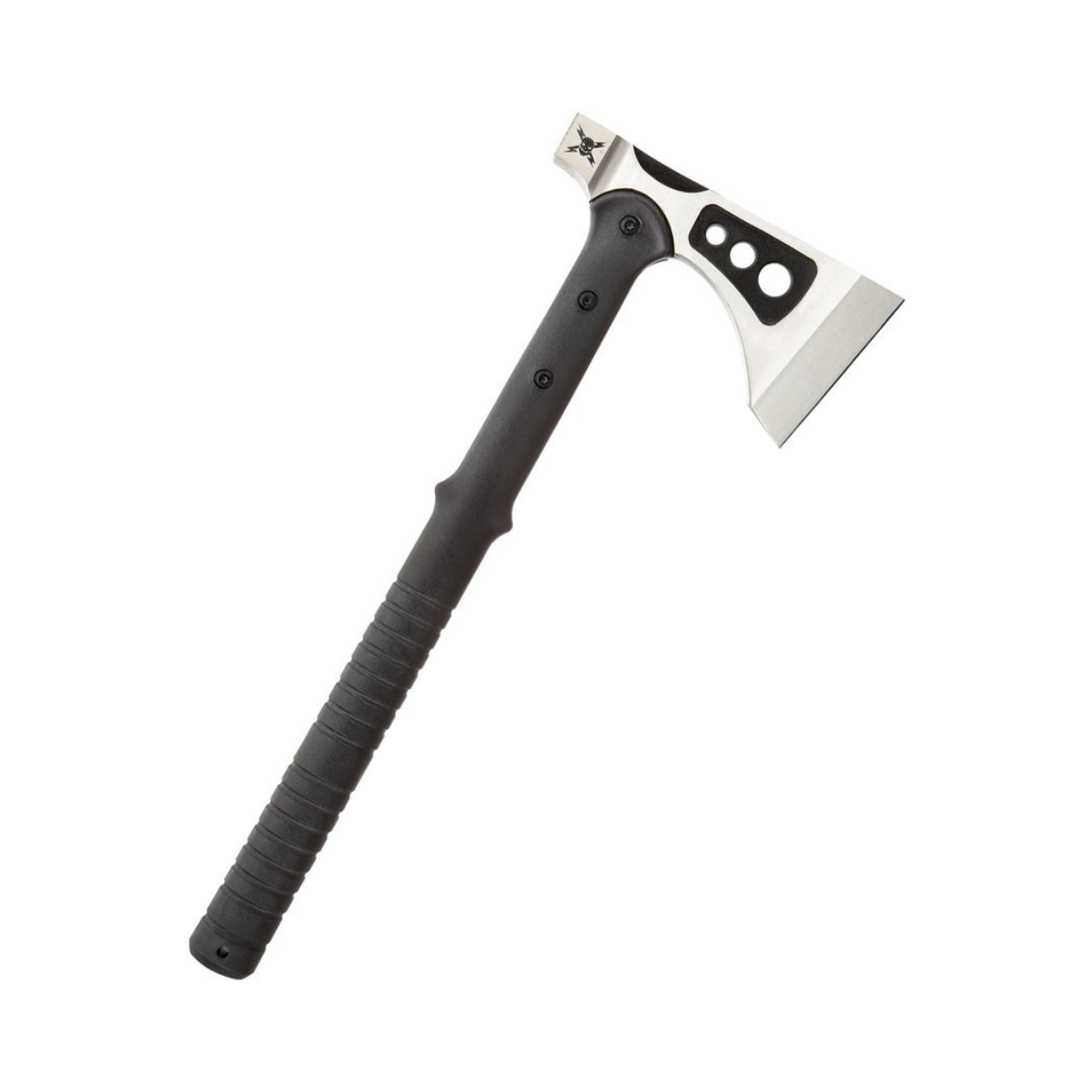 15.5" overall. 6.38" two-tone finish 3Cr13 stainless axe head with 3.25" cutting edge. Black nylon handle. Hammer end. Black nylon sheath. Boxed.