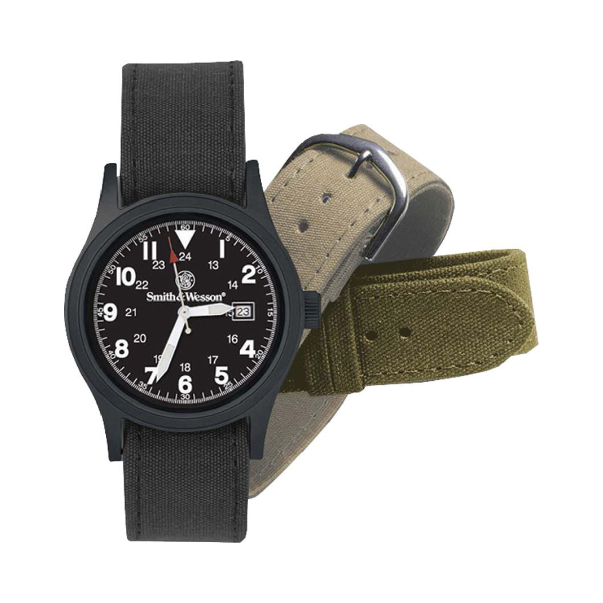 Black face. Features precision Japanese quartz movement, second hand, date, 12/24 hour military time, luminous hands and numerals, water resistant to 30 meters and comes with three interchangeable reinforced canvas bands.