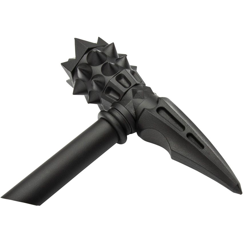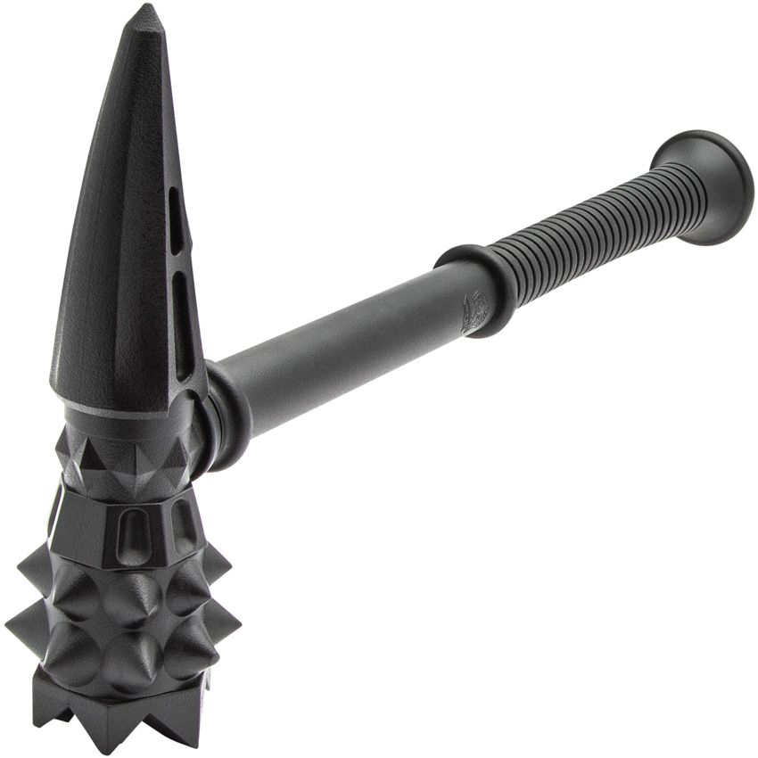 22" (55.88cm) overall. Lanyard hole. 10.25" hammer head crowned and circled with spikes and penetrating tomahawk-style back. Deeply grooved handle and skull crusher pommel. One-piece injection molded polypropylene construction.