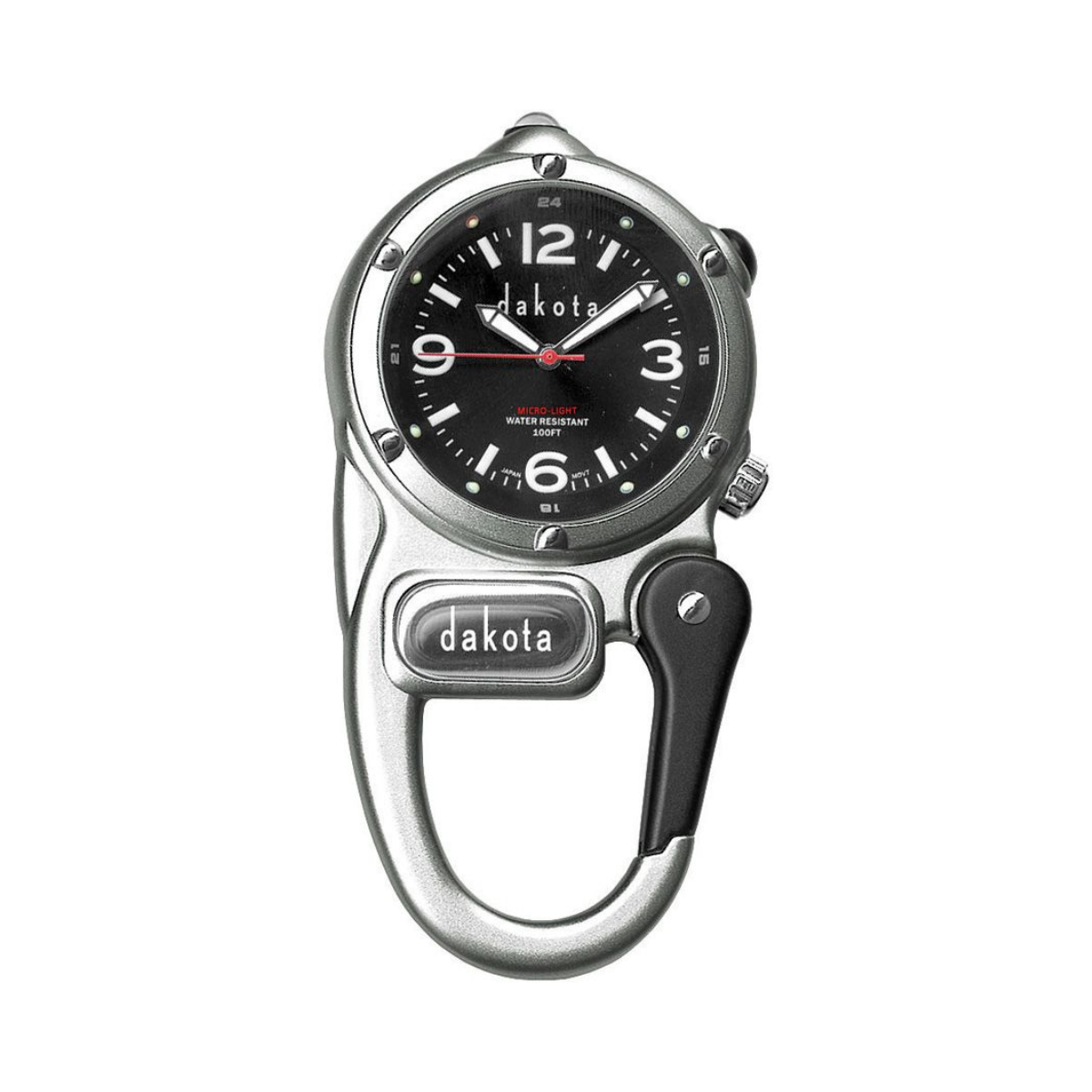 3.13" overall. Stainless steel back. Japan quartz movement. Water resistant to 100 feet. Red LED. Integrated carabiner clip. Each watch features luminous hands and markers, and mineral crystal. Comes with metal gift tin. Aluminum construction. Color: Silver. Boxed.