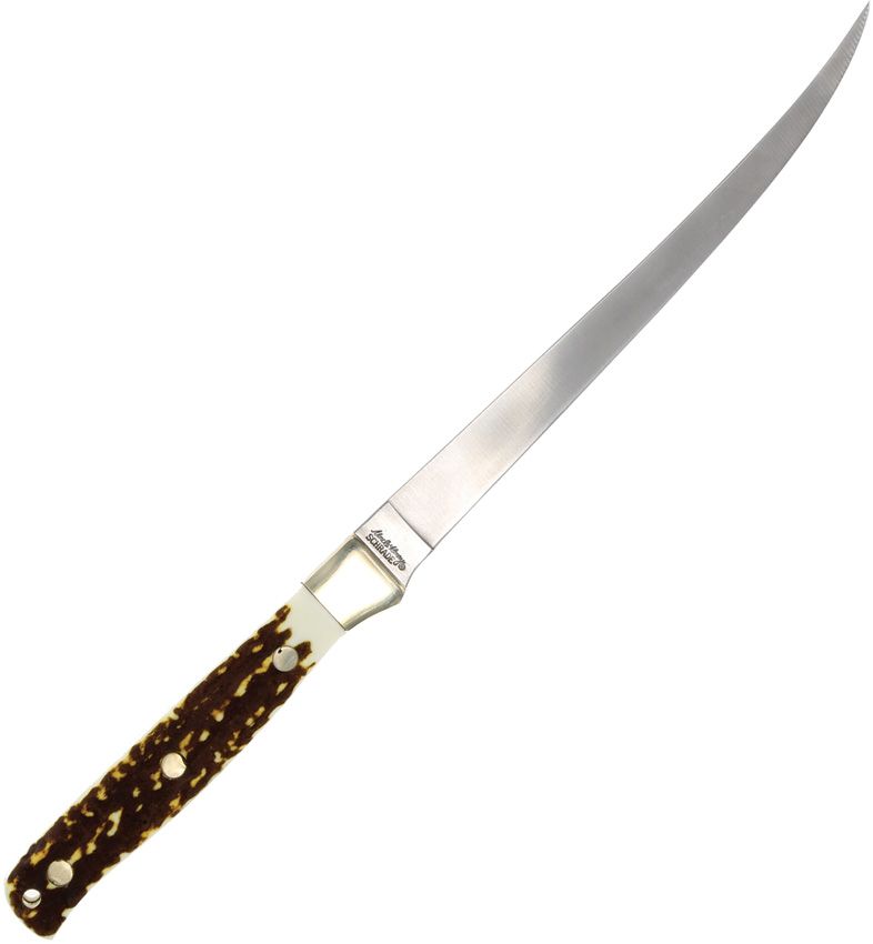 12" (30.48cm) overall. 7.5" (19.05cm) satin finish 7Cr17MoV stainless fillet blade. Staglon handle. Nickel silver bolster(s). Full tang. Lanyard hole. Brown leather belt sheath. Clam packed.