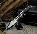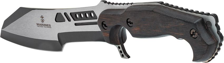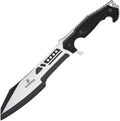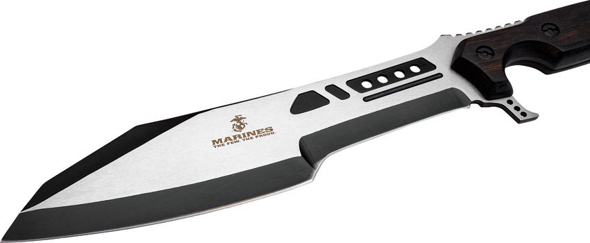 16" (40.64cm) overall. 10.5" (26.67cm) two-tone finish stainless blade. Black pakkawood handle. Weight reducing thru-holes and pronounced finger choil. Black nylon belt sheath. Boxed.
