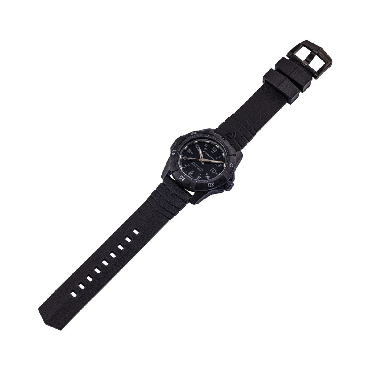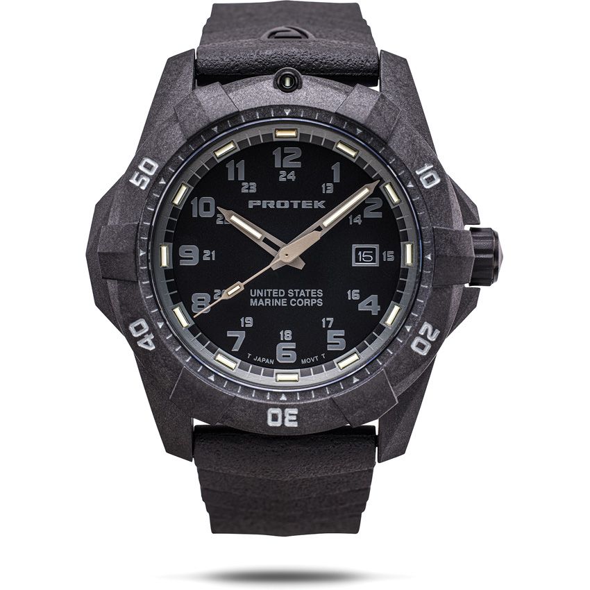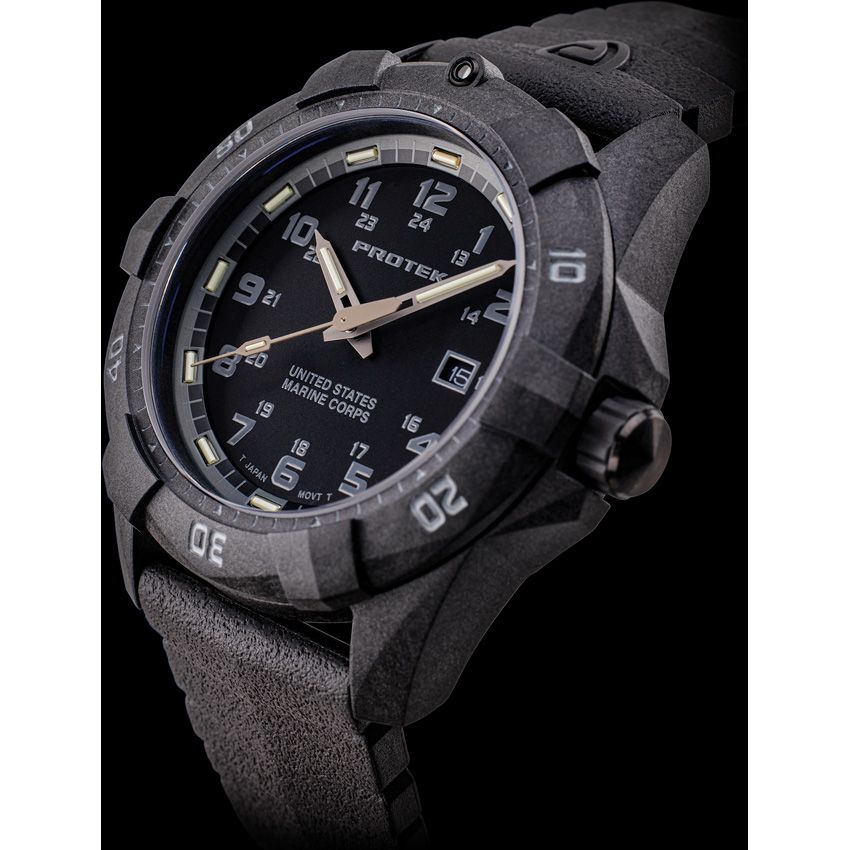42mm carbon composite case and bezel. Screw-on stainless case back with USMC logo emboss. Screw-in crown with rubber grip. Sapphire crystal with anti-reflective coating. Water resistant to 300 meters. Japanese quartz Miyota 2S60 3 hand and date movement with 10 year battery. Black rubber strap with steel tube for the spring pin molded into the strap. Swiss self-powered ProGlo T25 illumination system glows continuously for 25 years without needing to be charged by external light. Blackout design. Boxed.