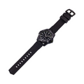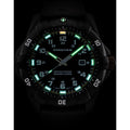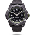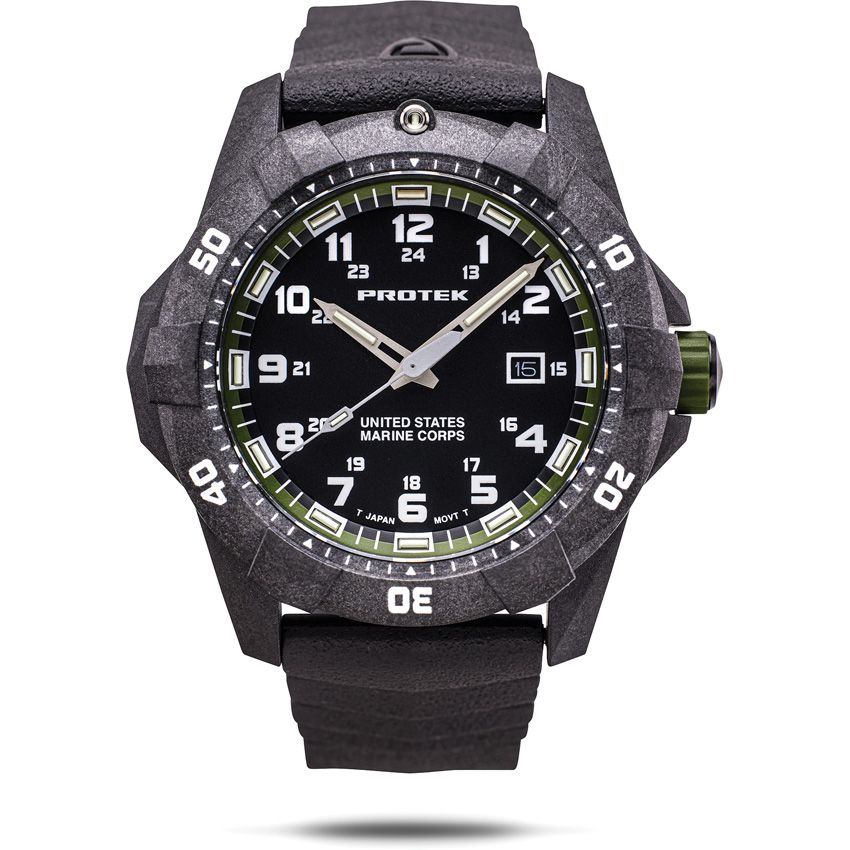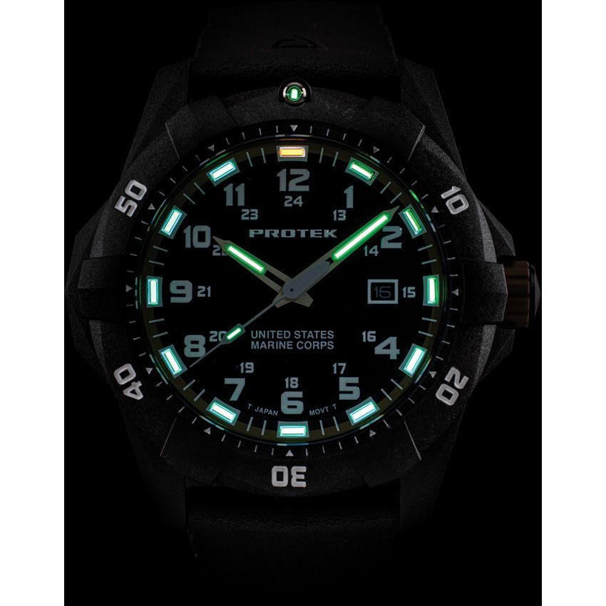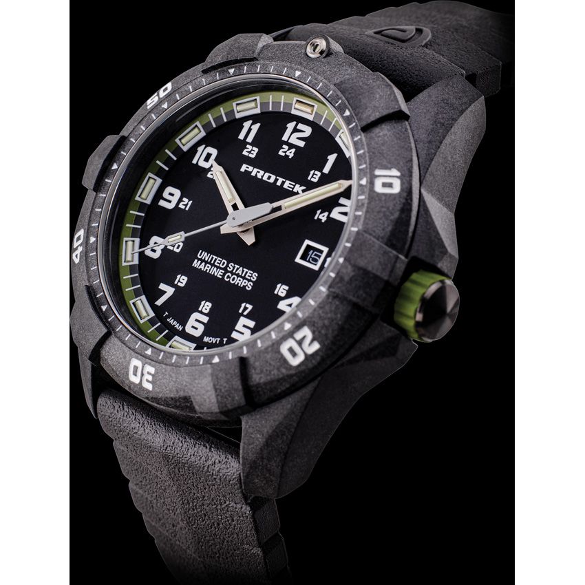 42mm carbon composite case and bezel. Screw-on stainless case back with USMC logo emboss. Screw-in crown with rubber grip. Sapphire crystal with anti-reflective coating. Water resistant to 300 meters. Japanese quartz Miyota 2S60 3 hand and date movement with 10 year battery. Black rubber strap with steel tube for the spring pin molded into the strap. Swiss self-powered ProGlo T25 illumination system glows continuously for 25 years without needing to be charged by external light. Green accents. Boxed.