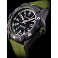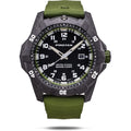 42mm carbon composite case and bezel. Screw-on stainless case back with USMC logo emboss. Screw-in crown with rubber grip. Sapphire crystal with anti-reflective coating. Water resistant to 300 meters. Japanese quartz Miyota 2S60 3 hand and date movement with 10 year battery. Green rubber strap with steel tube for the spring pin molded into the strap. Swiss self-powered ProGlo T25 illumination system glows continuously for 25 years without needing to be charged by external light. Green accents. Boxed.