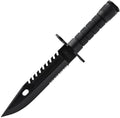 12" (30.48cm) overall. 7" (17.78cm) black matte finish partially serrated stainless blade. Black TPU handle. Sawback blade. Muzzle ring guard. Black nylon belt sheath. Boxed.