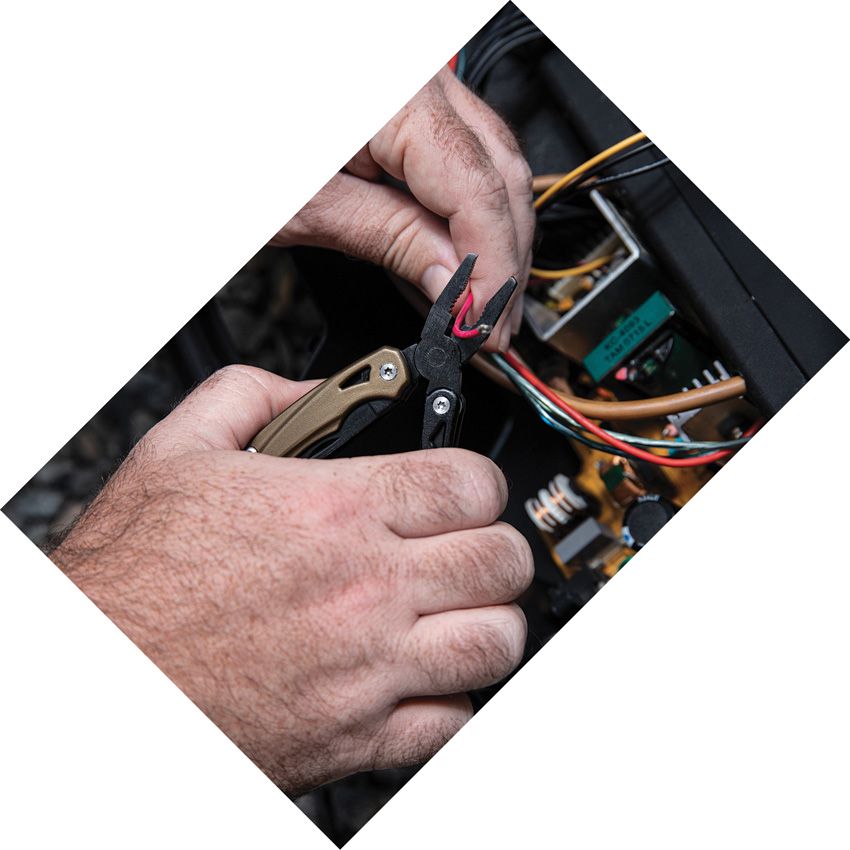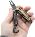 4.5" overall. Tan aluminum handles. Tools include: Pliers l Small blade l Saw blade l Bottle opener l Phillips screwdriver l Carabiner. Boxed.