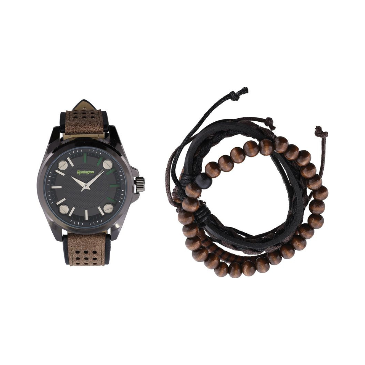 Water and shock resistant. Stainless back. Scratch resistant mineral glass. Japanese movement in Remington green. Brown leather watch strap. Includes leather and bead wrap bracelet. Gift tin.
